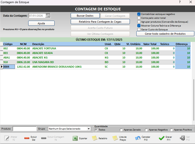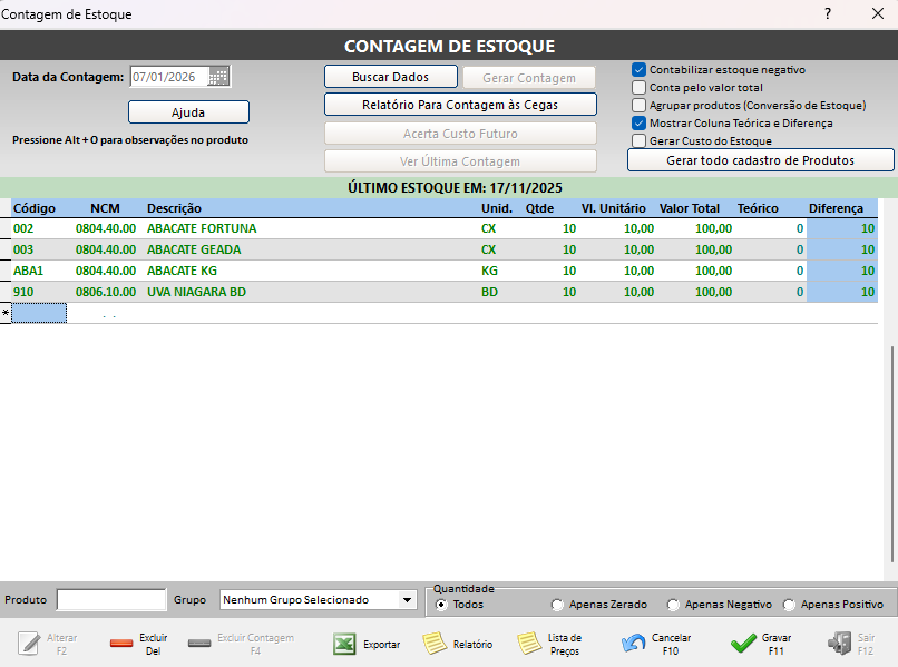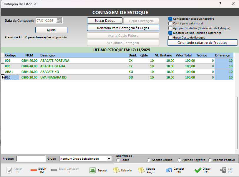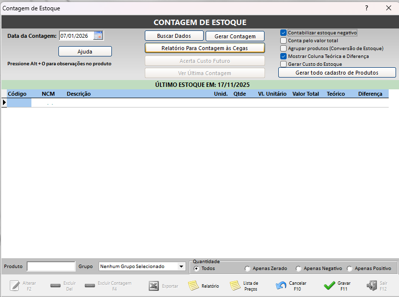 Se for utilizar o Relatório para Contagem às Cegas, cuidado com o estoque negativo, pois esses produtos não estarão fisicamente disponíveis para contagem.