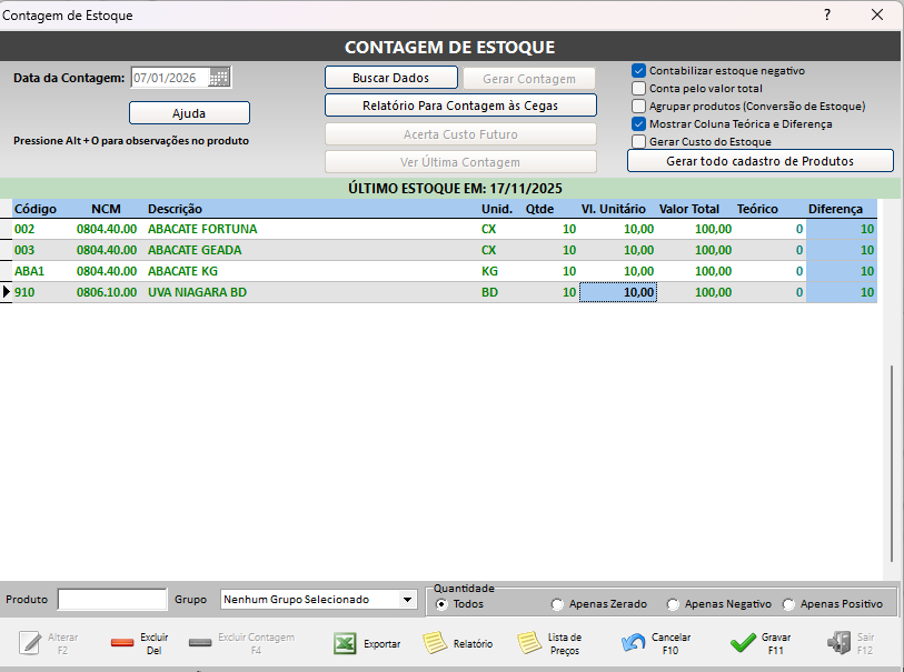 Se for utilizar o Relatório para Contagem às Cegas, cuidado com o estoque negativo, pois esses produtos não estarão fisicamente disponíveis para contagem.