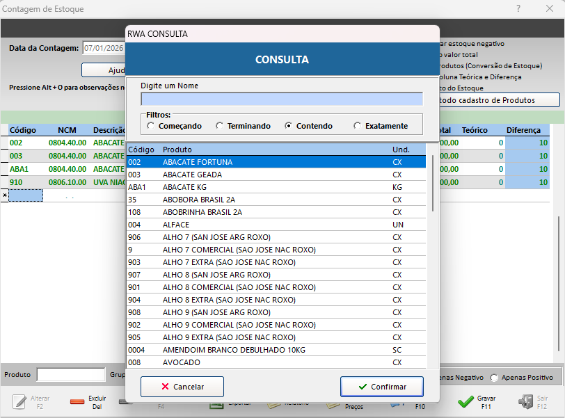Ao gerar a contagem, o RWA Sistema apresenta uma sugestão automática, baseada na seguinte lógica: