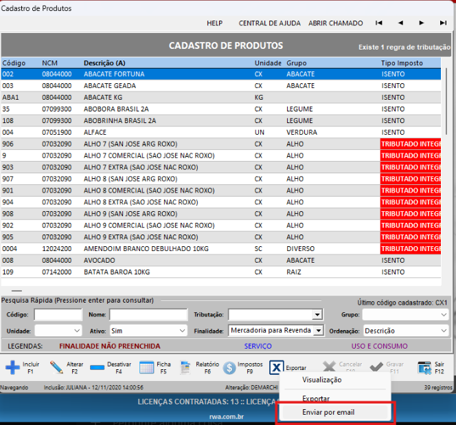 Para facilitar a atualização da Classificação Tributária dos produtos, o RWA Sistema permite exportar o cadastro completo para uma planilha Excel.