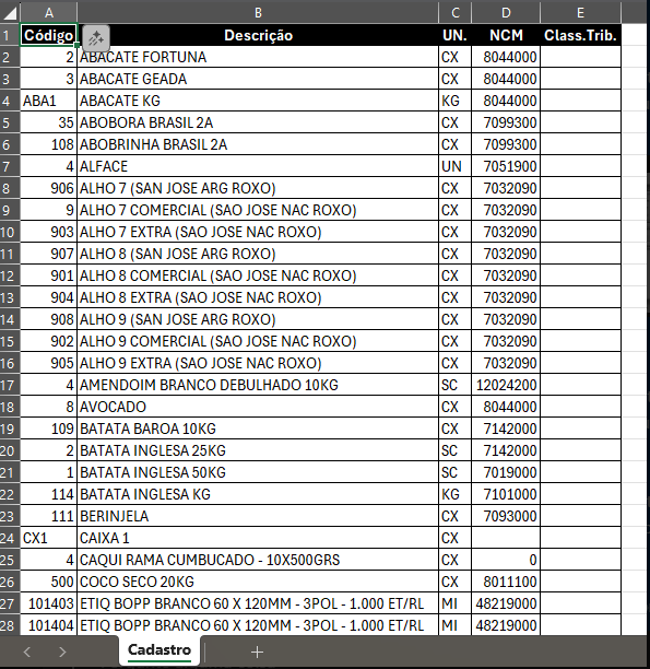 📝 As células da coluna Class.Trib. devem ser preenchidas com o código correto disponível na tabela oficial do governo.