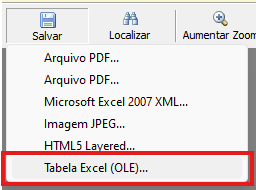 No Menu Salvar, vá el Tabela Excel (OLE)