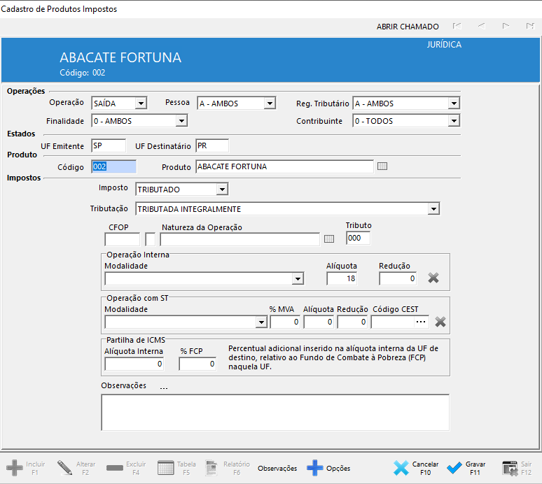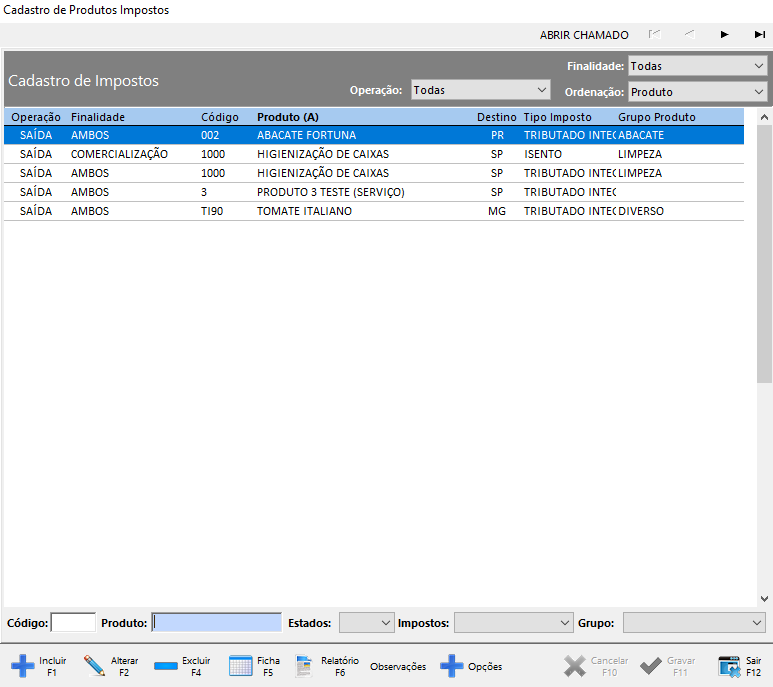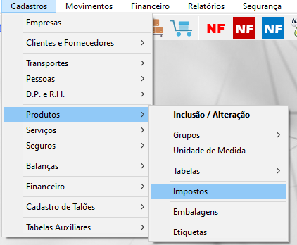 Cadastros > Produtos > Impostos