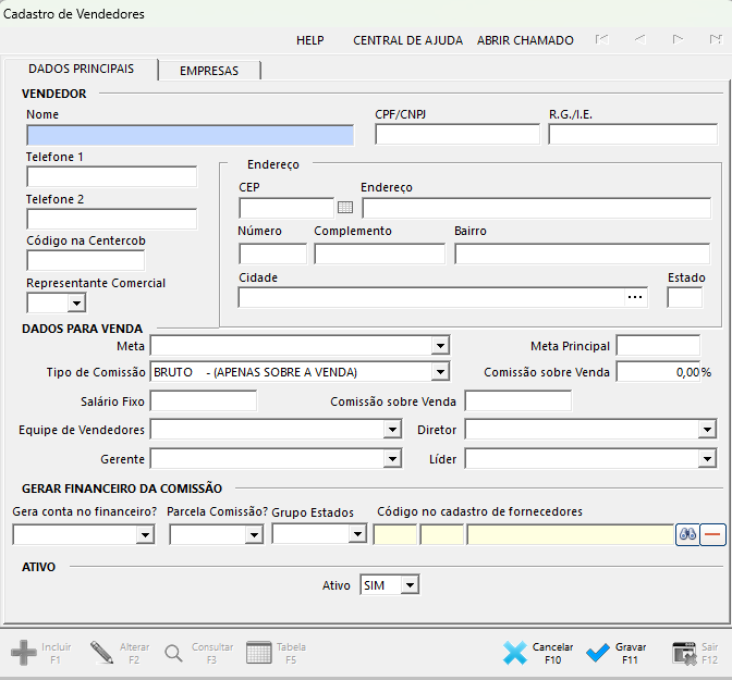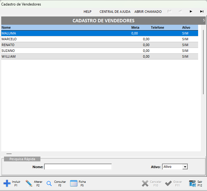 - Será aberta a tela de Cadastro de Vendedores.